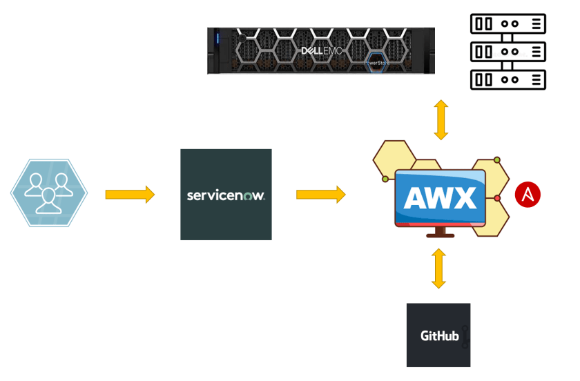 I want to share details of an environment I deployed. It allows the provisioning of Dell PowerStore volumes to your private cloud infrastructure using ServiceNow and Ansible. This gives customers the ability to provide end-users with a Self Service portal with an approval process for storage provisioning and configuration. ServiceNow also gives you the ability to charge back business units for the services they consume.